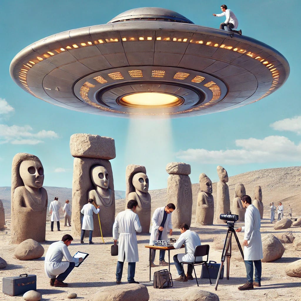 Here's that prompt: "A flying saucer hovering over the ancient archaeological site of Göbekli Tepe, with its distinctive stone pillars and carvings visible. Several scientists in modern clothing are on the ground, using various instruments like cameras, measuring devices, and notepads to study the UFO. The scene is set in broad daylight with a clear blue sky, emphasizing the contrast between the ancient site and the futuristic spacecraft. The scientists appear focused and somewhat astonished as they conduct their measurements and observations."